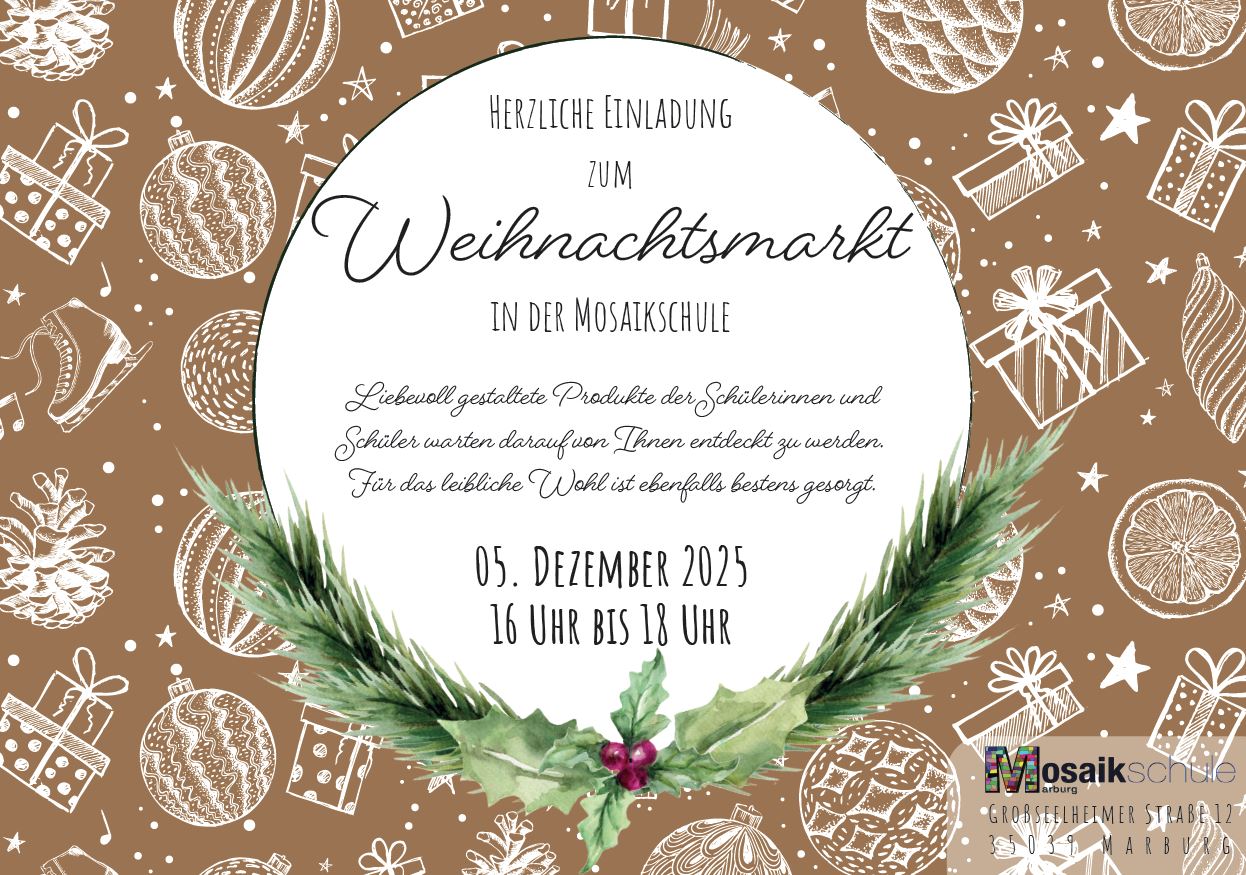 Von 16:00 bis 18:00 Uhr verwandelt sich das Schulgebäude der Mosaikschule in eine festliche Winterwelt. Freut Euch auf liebevoll gestaltete Stände, handgemachte Geschenke und weihnachtliche Leckereien. Für das leibliche Wohl ist ebenfalls gesorgt. Wir freuen uns auf ein gemütliches Beisammensein mit Euch – Eltern, Angehörigen, Freunden und allen, die Teil unserer Schulgemeinschaft sind oder es werden möchten!